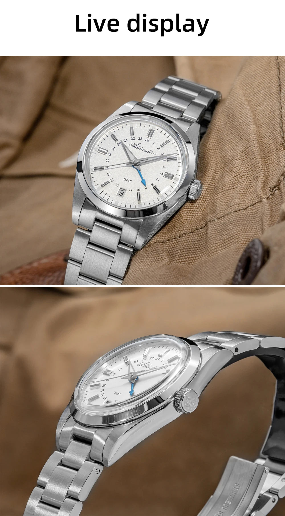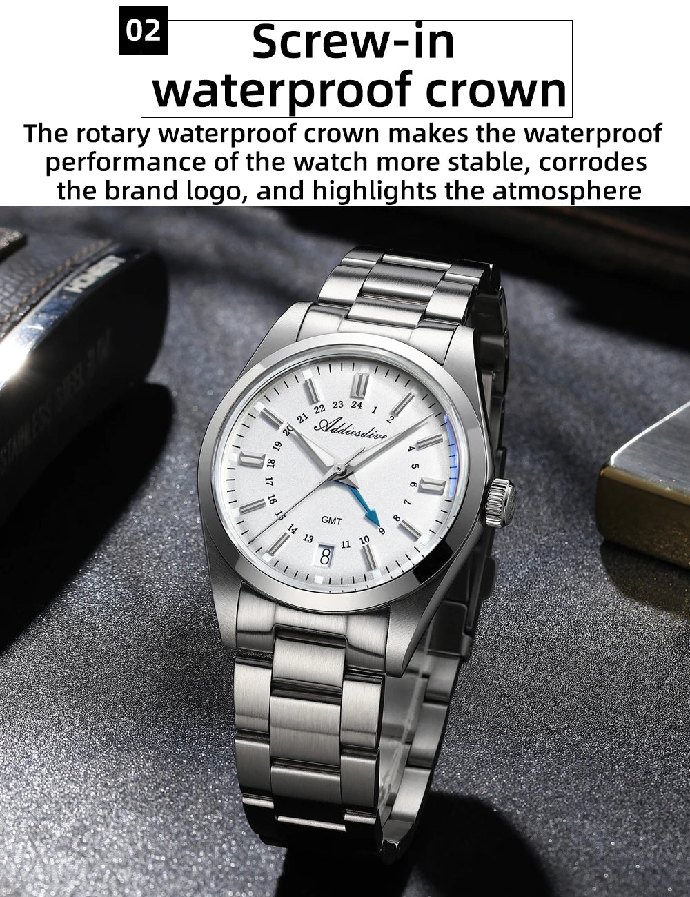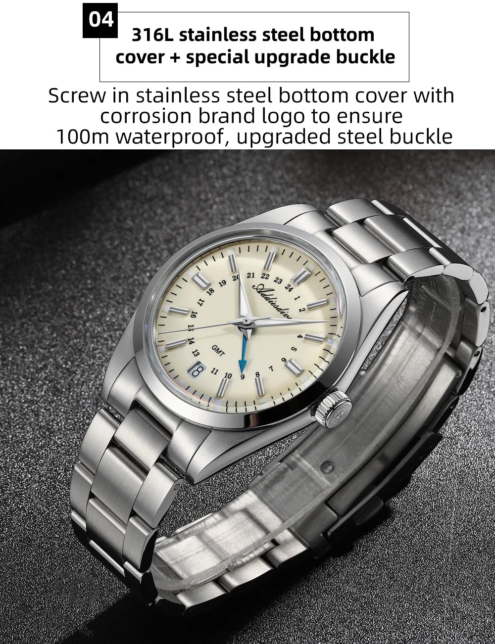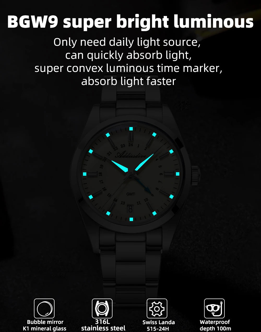 Au cœur de la AD2065 bat un mouvement quartz GMT suisse 515-24H. Il permet de lire simultanément l’heure locale et une seconde zone horaire, avec une clarté immédiate. Cette fonction n’est pas décorative. Elle est conçue pour celles et ceux qui voyagent, travaillent à distance ou vivent entre plusieurs fuseaux.
