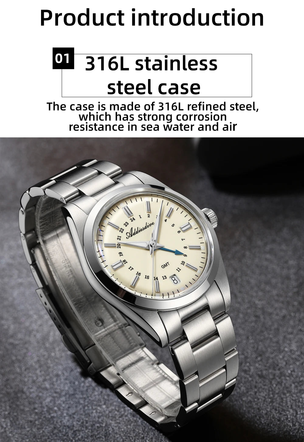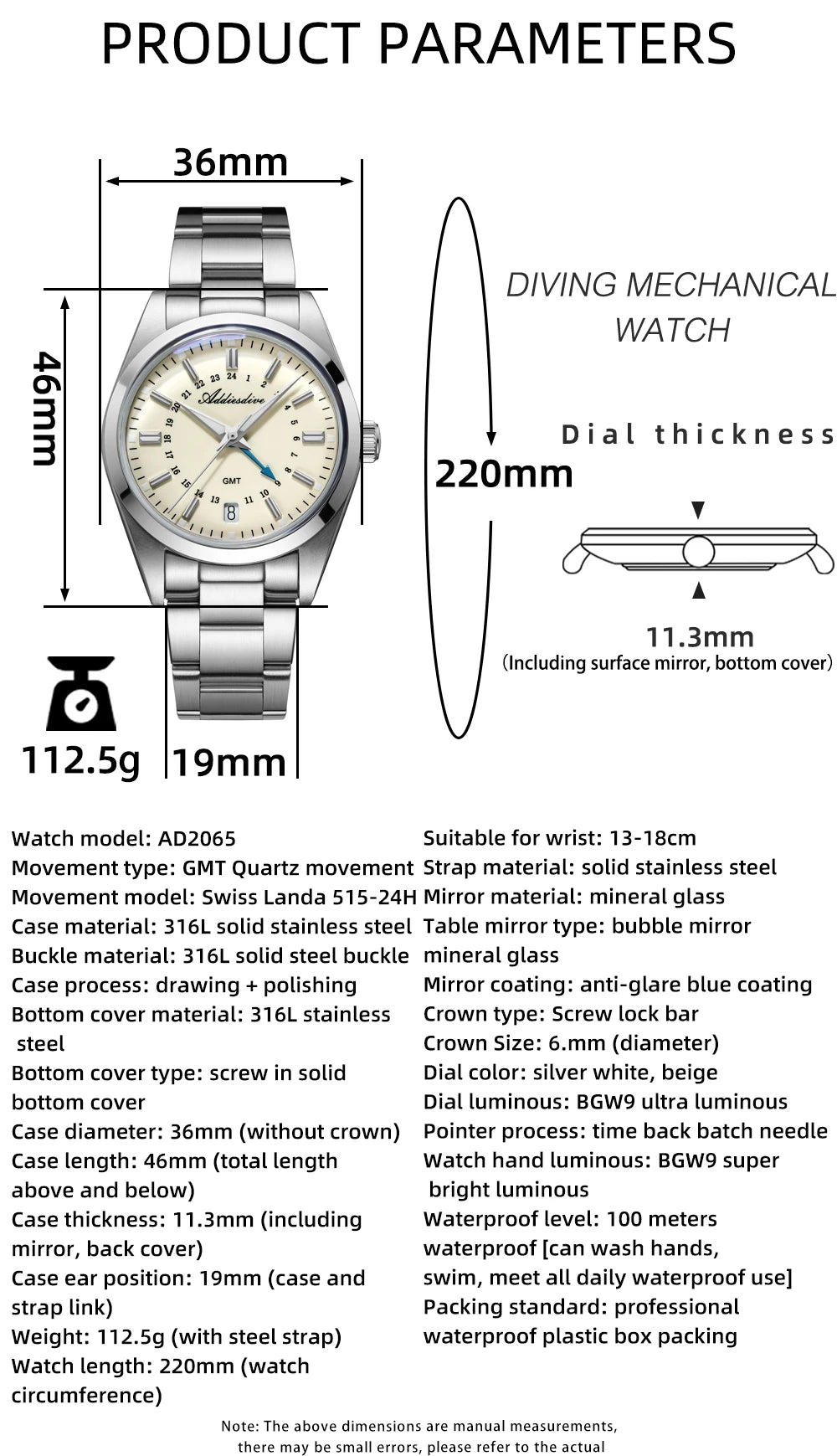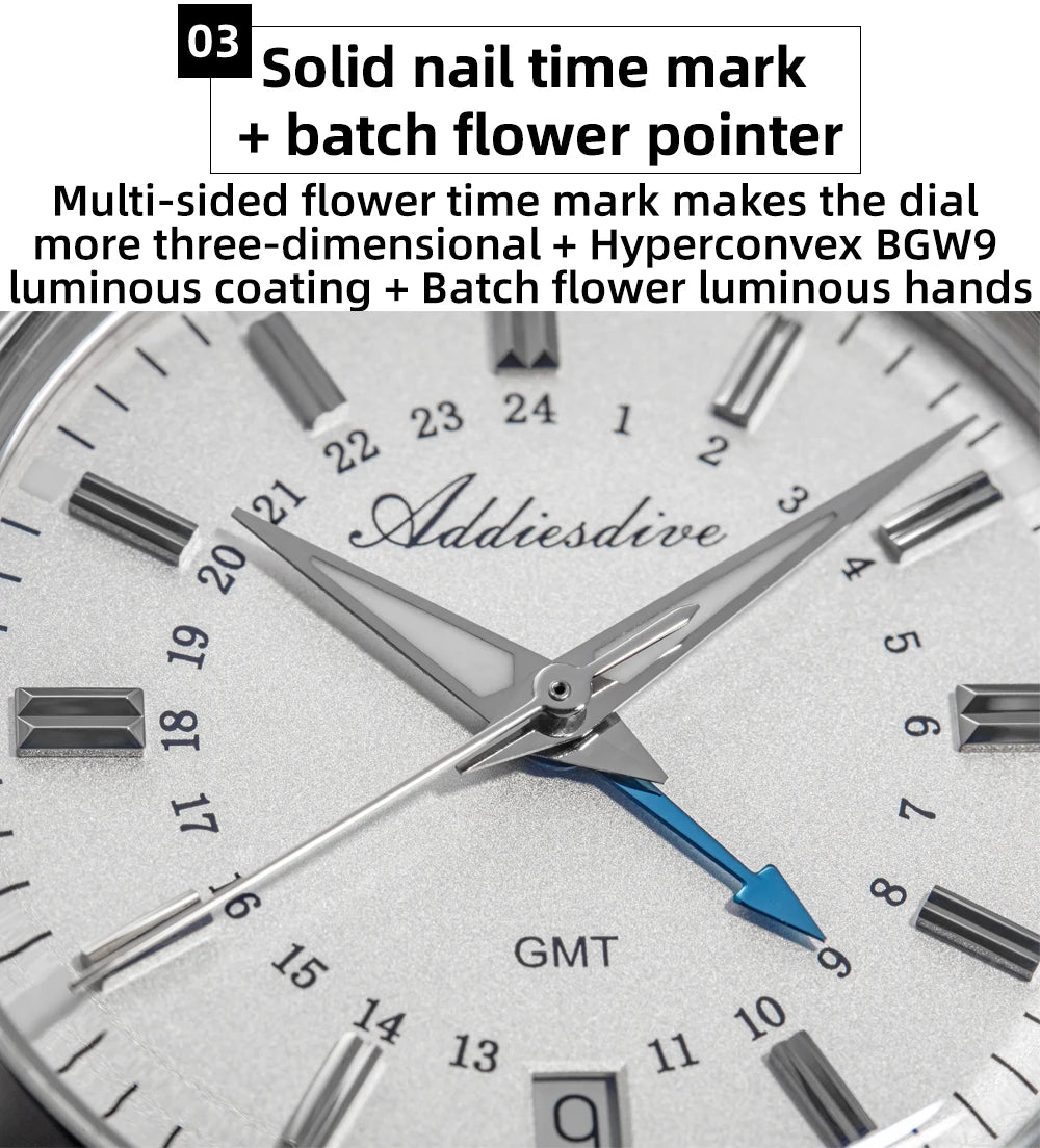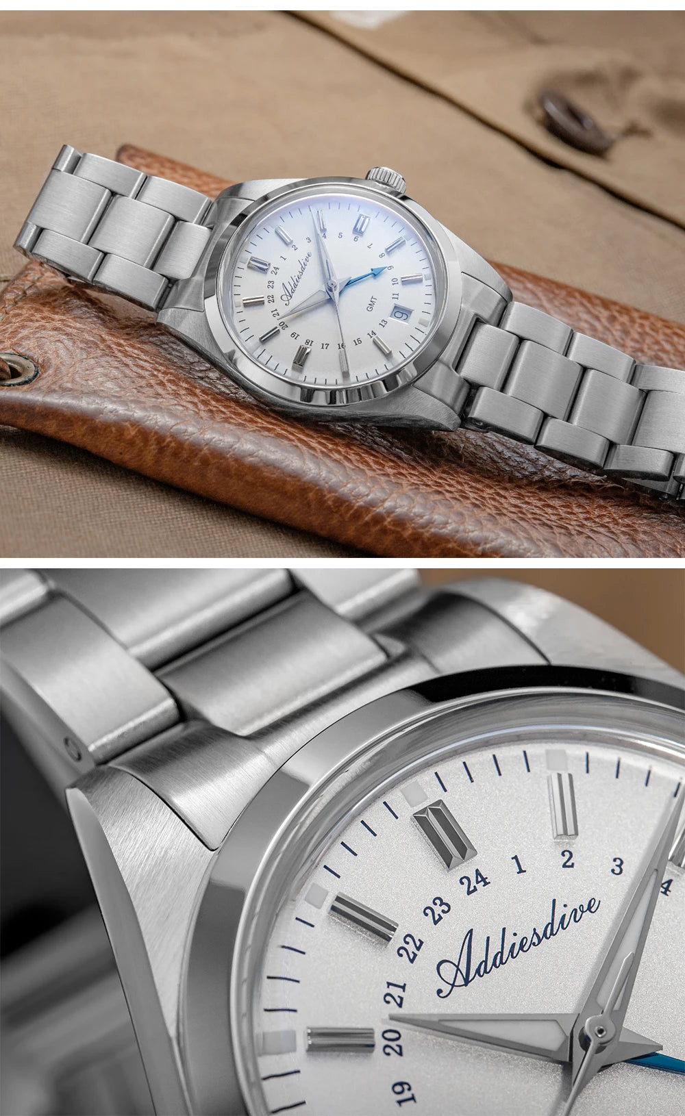 Au cœur de la AD2065 bat un mouvement quartz GMT suisse 515-24H. Il permet de lire simultanément l’heure locale et une seconde zone horaire, avec une clarté immédiate. Cette fonction n’est pas décorative. Elle est conçue pour celles et ceux qui voyagent, travaillent à distance ou vivent entre plusieurs fuseaux.