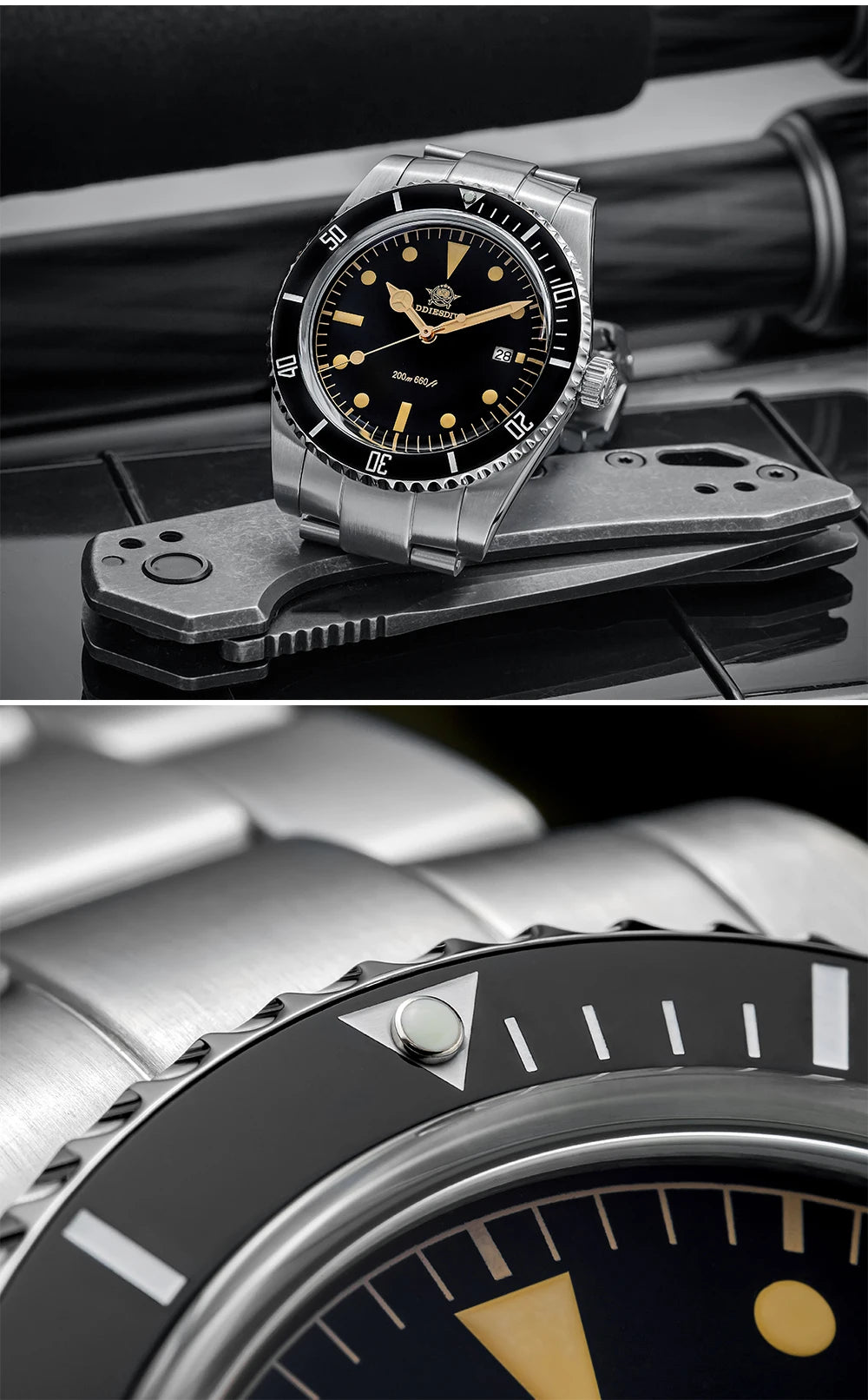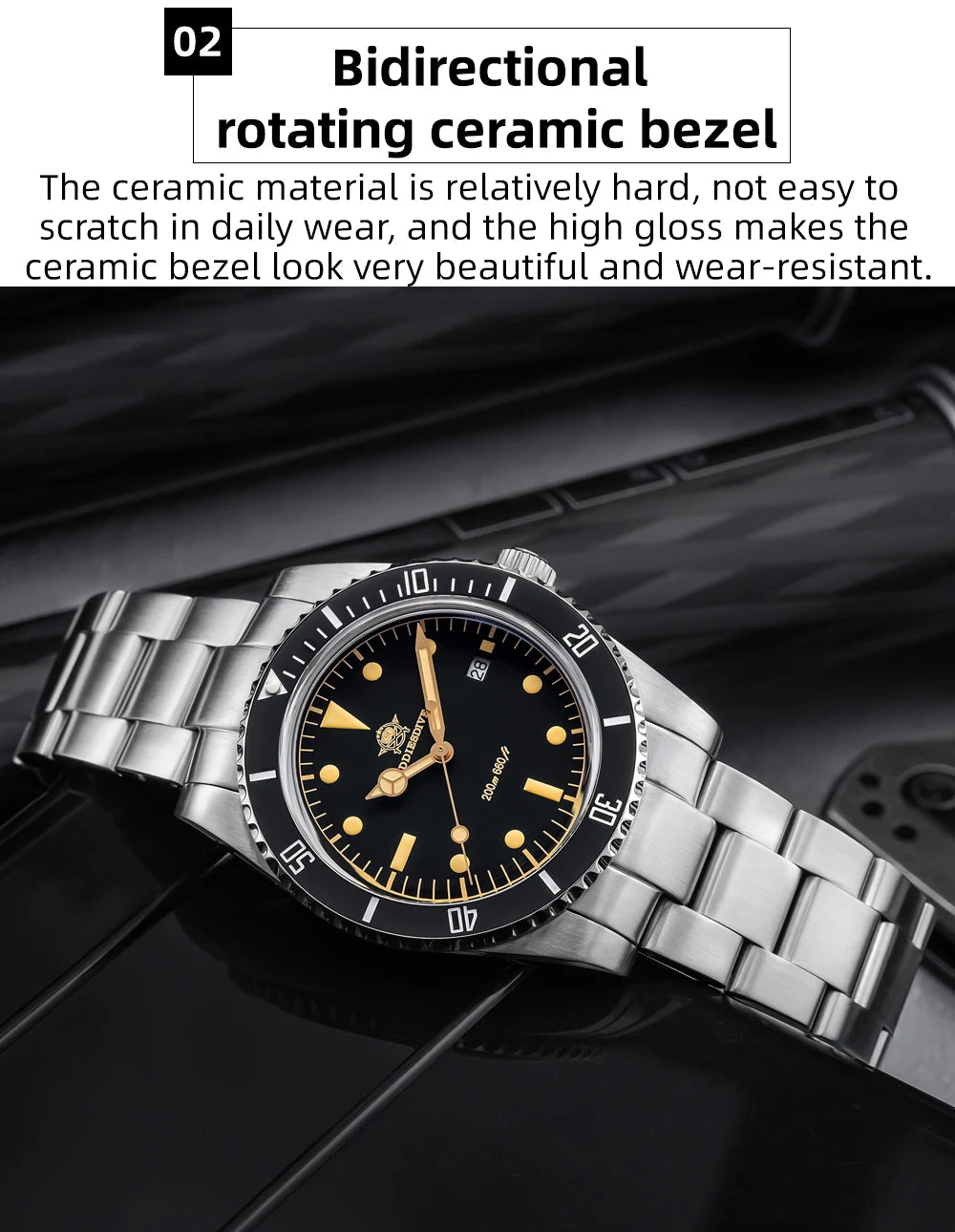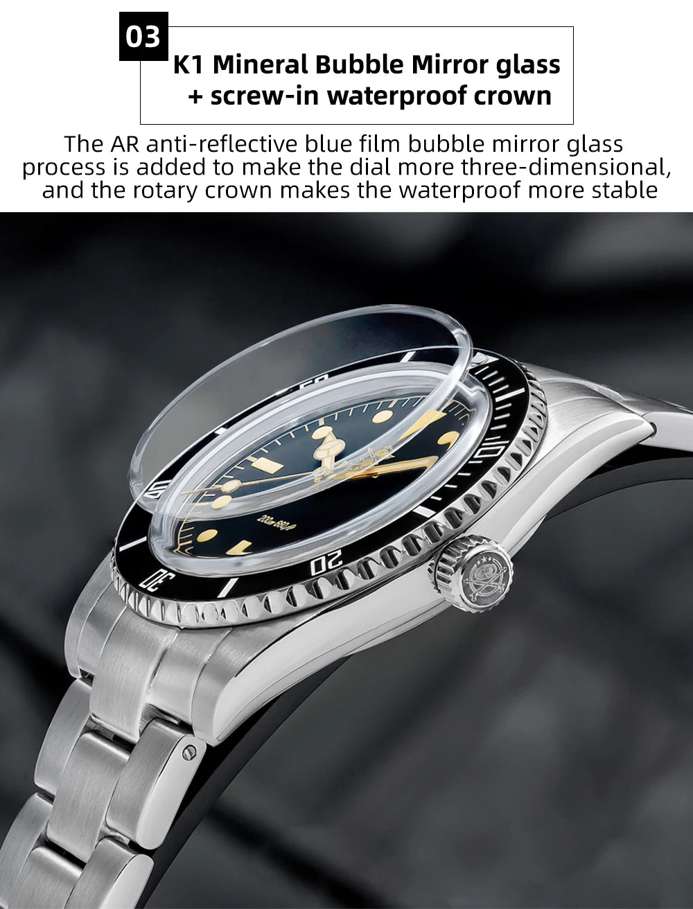Sa lunette en céramique, à rotation bidirectionnelle crantée, apporte une précision d’usage et une résistance durable. Délibérément non lumineuse, elle renforce le caractère vintage et instrument de la montre. Le verre minéral K1 bombé, traité antireflet bleu, protège efficacement le cadran tout en améliorant la lisibilité sous lumière directe ou à la surface de l’eau.