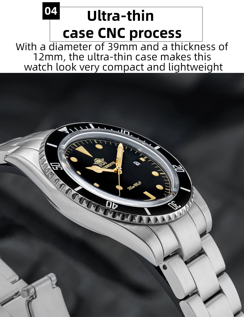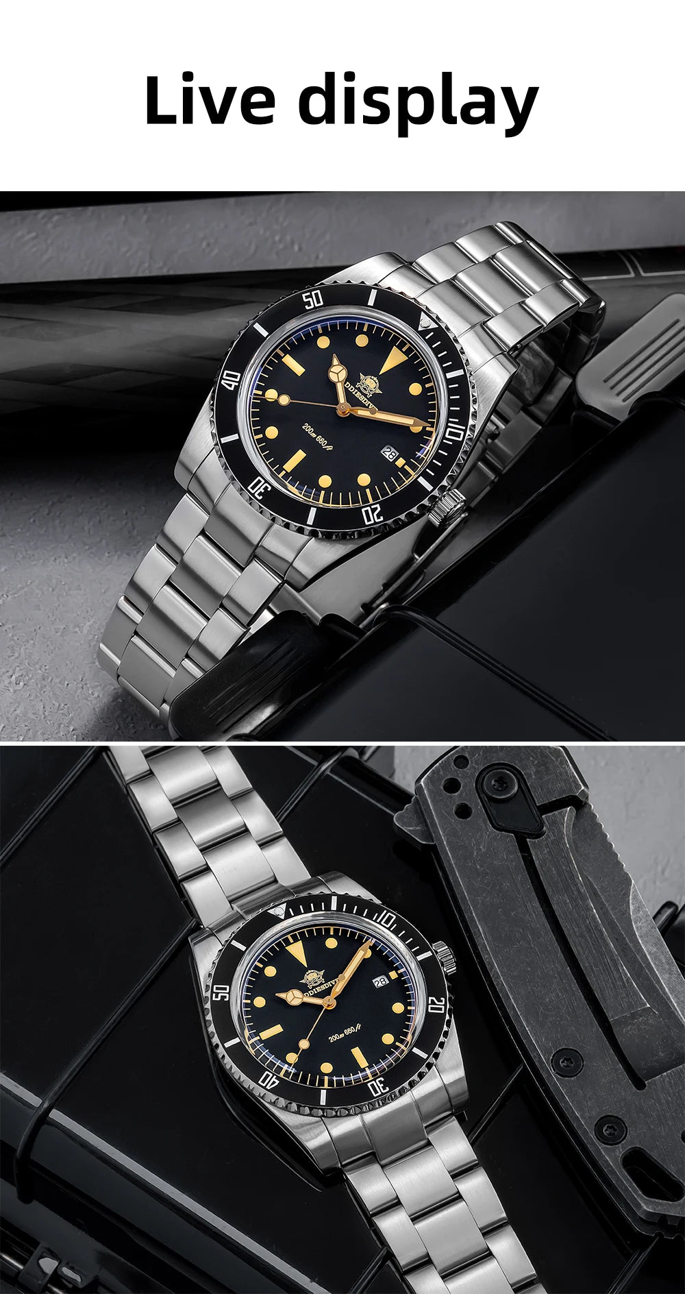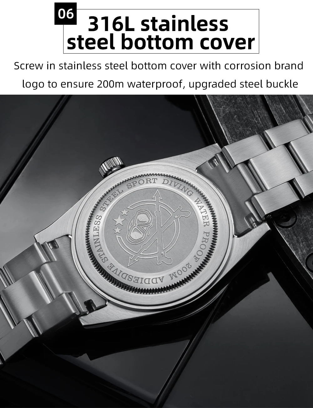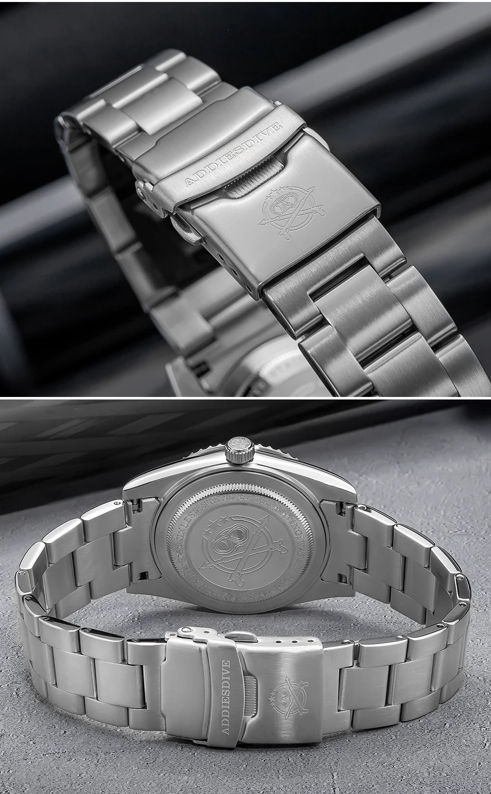 Le boîtier en acier inoxydable 316L, travaillé par sablage puis polissage, donne au métal une texture vivante. Rien n’est trop brillant, rien n’est froid. Le bracelet acier, équipé d’une boucle déployante sécurisée, prolonge cette impression de continuité solide. Une fois au poignet, la montre se stabilise naturellement et ne bouge plus.