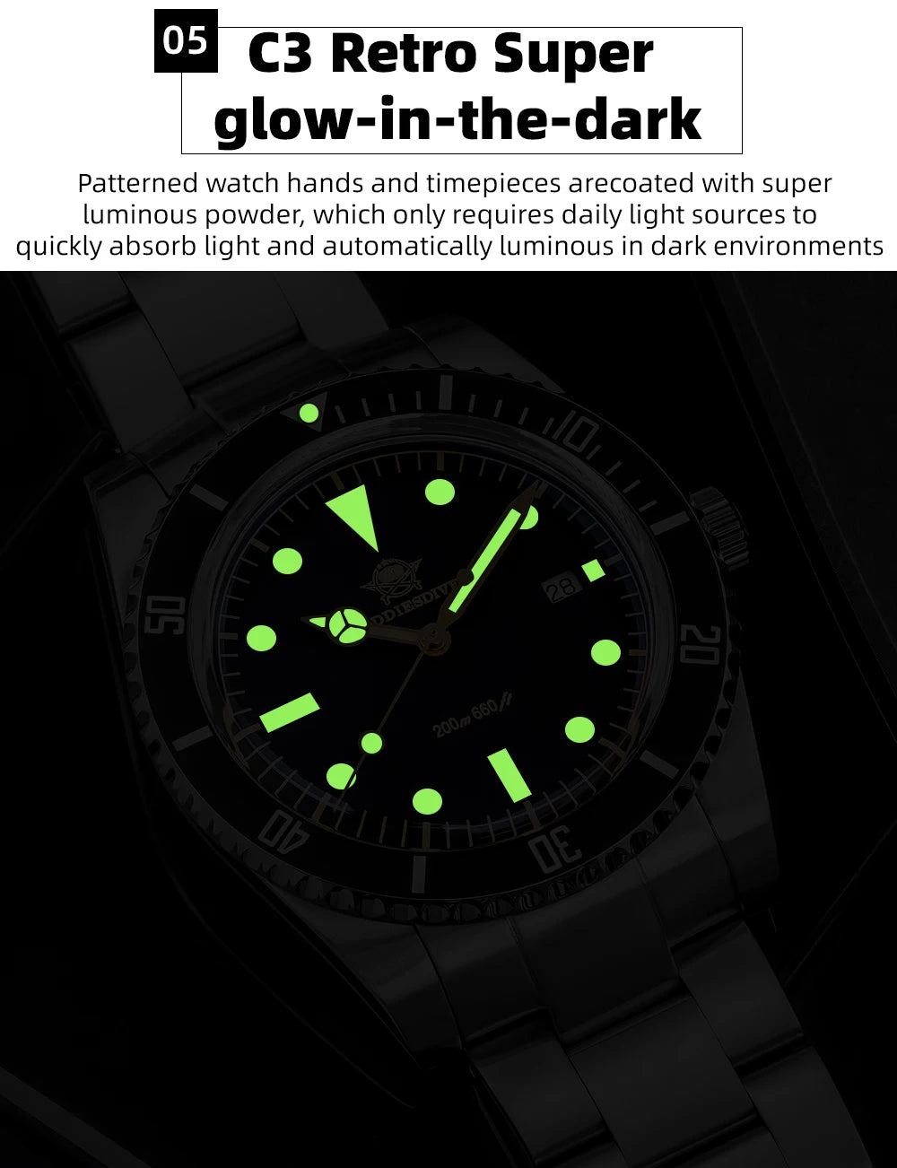 Le cadran adopte une approche résolument rétro. Les marqueurs horaires super-convexes, traités en poudre luminescente C3 vintage, diffusent une lumière jaune-verte douce et chaleureuse lorsque la luminosité baisse. Les aiguilles, au dessin fluide, complètent cette lecture apaisée et immédiatement compréhensible.